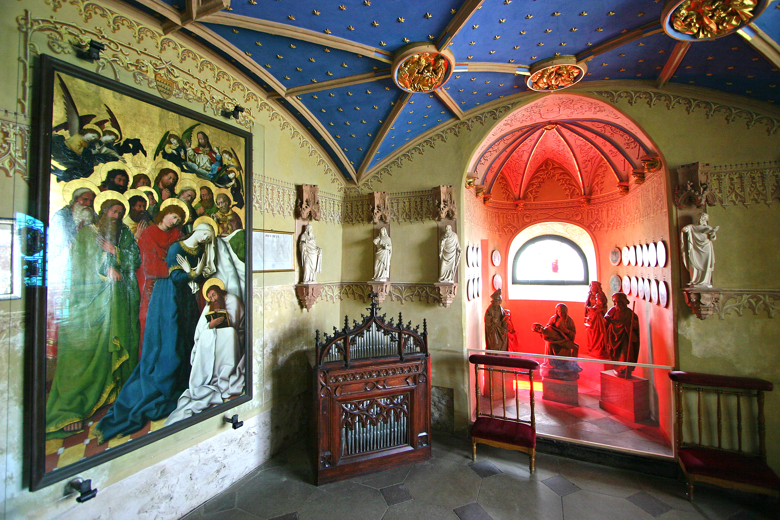 Im 1. Obergeschoss befinden sich das reich bemalte Königszimmer, das Wappenzimmer und das Erkerzimmer mit mittelalterlichen Möbeln. Von hier aus betritt man den größten wie auch schönsten Raum, den Rittersaal. Die Wände sind mit Holz getäfelt und die Decke und Fensterleibungen sind ungemein reich und wirkungsvoll ausgemalt.